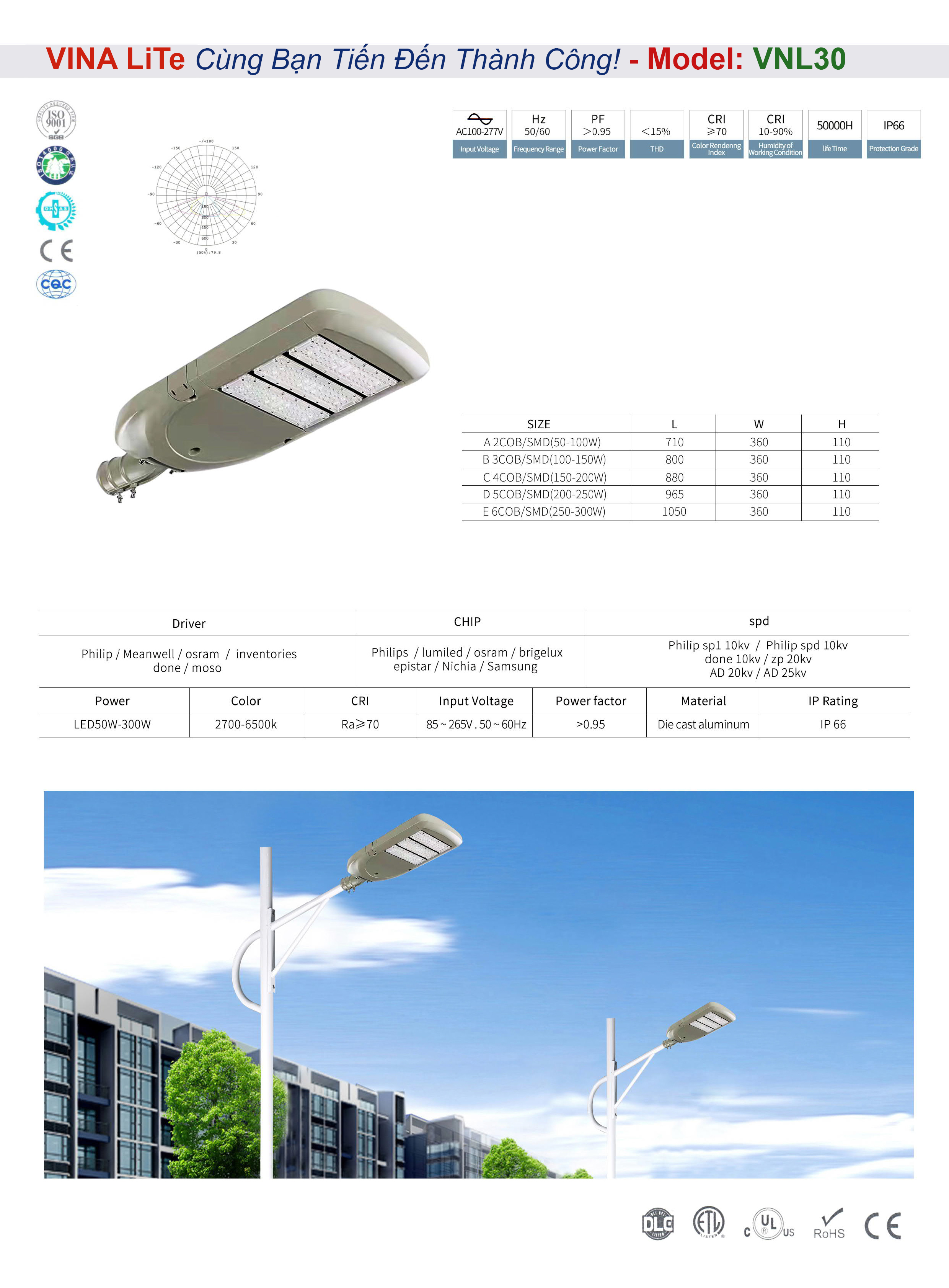 Các loại đèn LED đường phố của VINA LiTe được thiết kế để đáp ứng các yêu cầu khắt khe về chiếu sáng đường phố. Sản phẩm này có khả năng tiết kiệm năng lượng lớn hơn so với các loại đèn truyền thống và đáp ứng được các yêu cầu về ánh sáng và màu sắc để tạo ra không gian sống và làm việc an toàn và thoải mái cho cộng đồng.