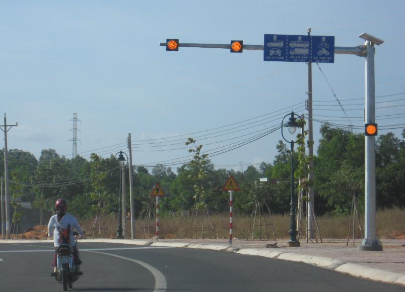 Trụ đèn chớp vàng năng lượng mặt trời thường được triển khai ở các vùng hạn chế thi công mới theo dạng điện lưới, mặc dù không tham gia điều tiết giao thông nhưng vẫn đảm bảo tính cảnh báo các phương tiện lưu ý khi tham gia giao thông