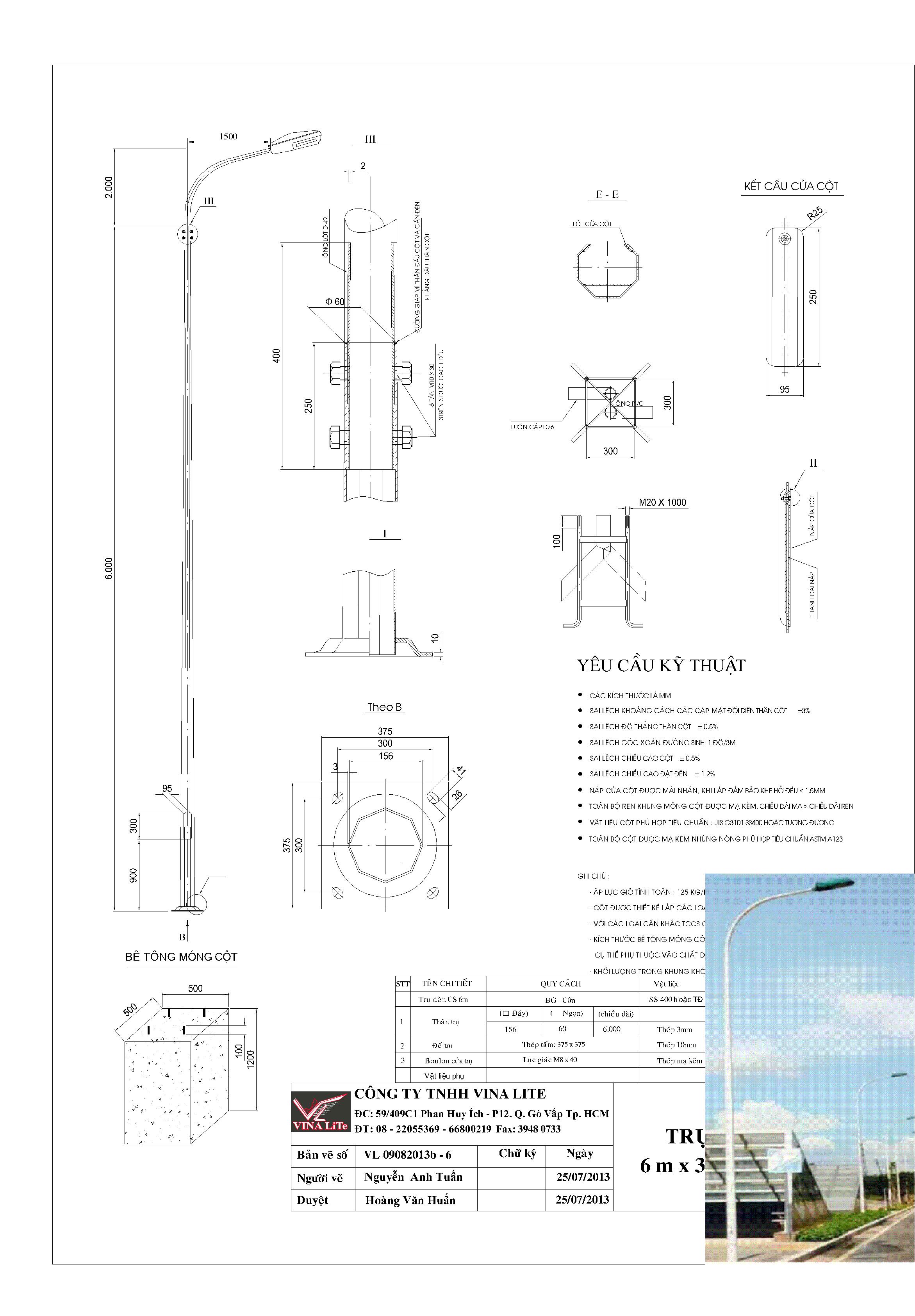 * Trụ đèn chiếu sáng theo tiêu chuẩn của VINA LiTe được thiết kế chịu sức gió 45m/s tương đương vận tốc gió 160Km/h.